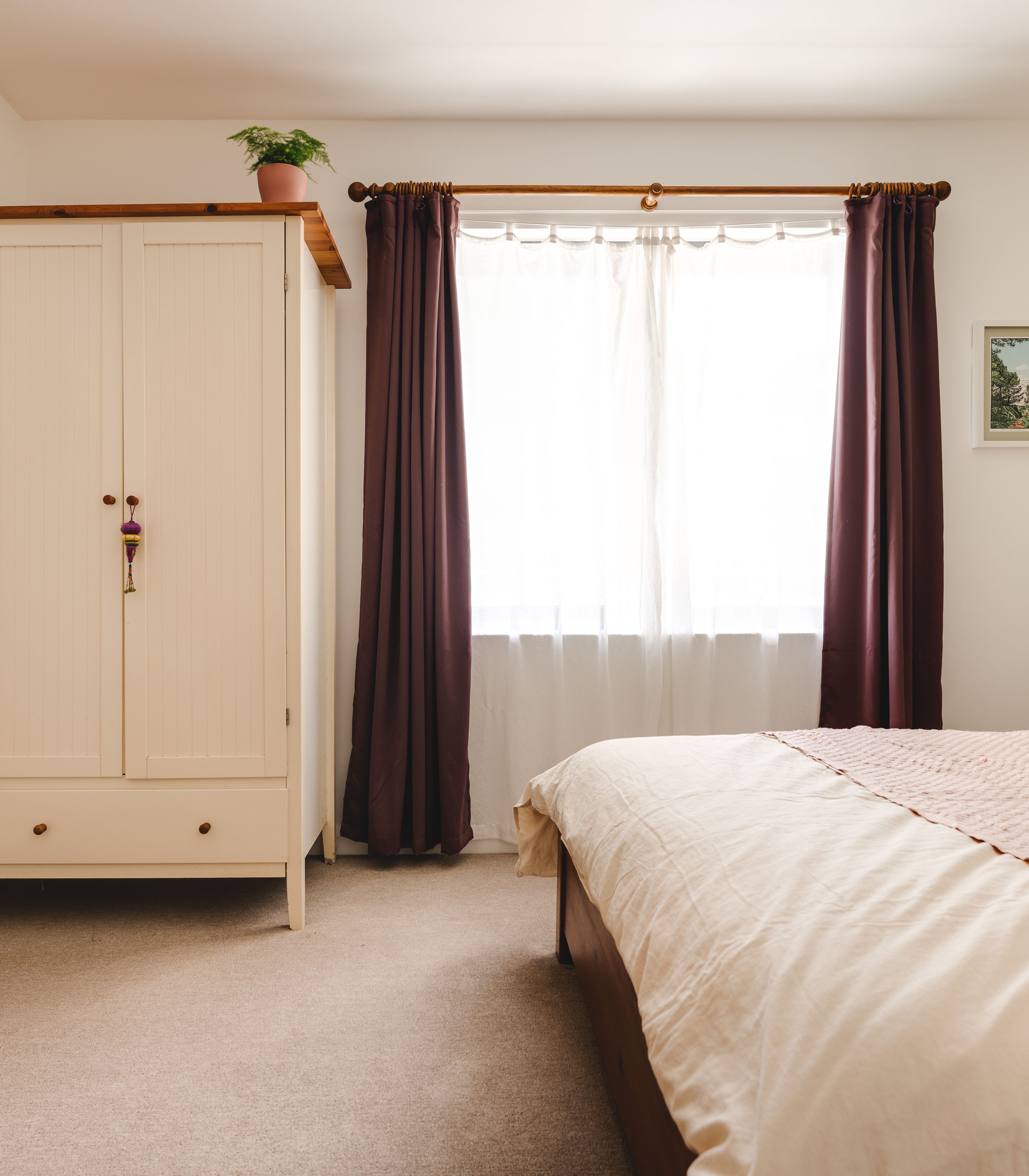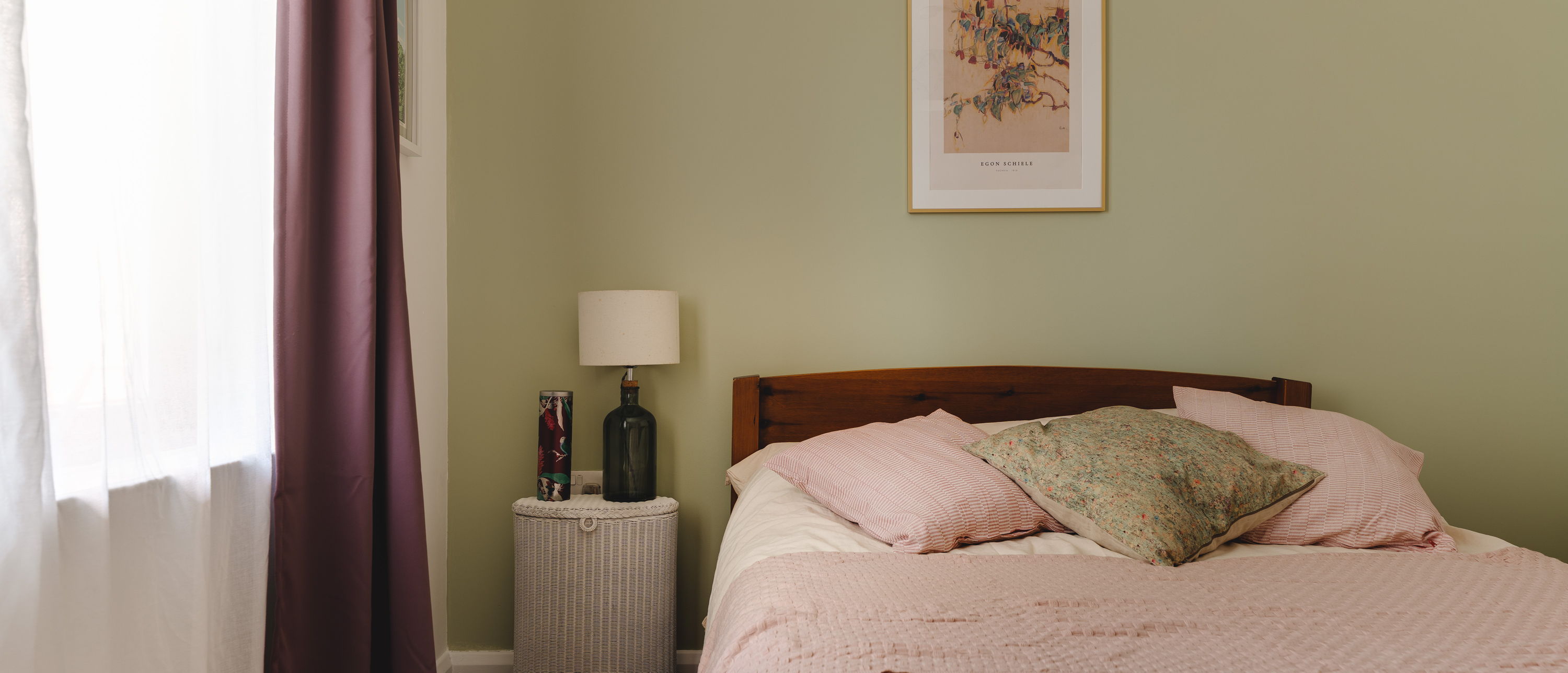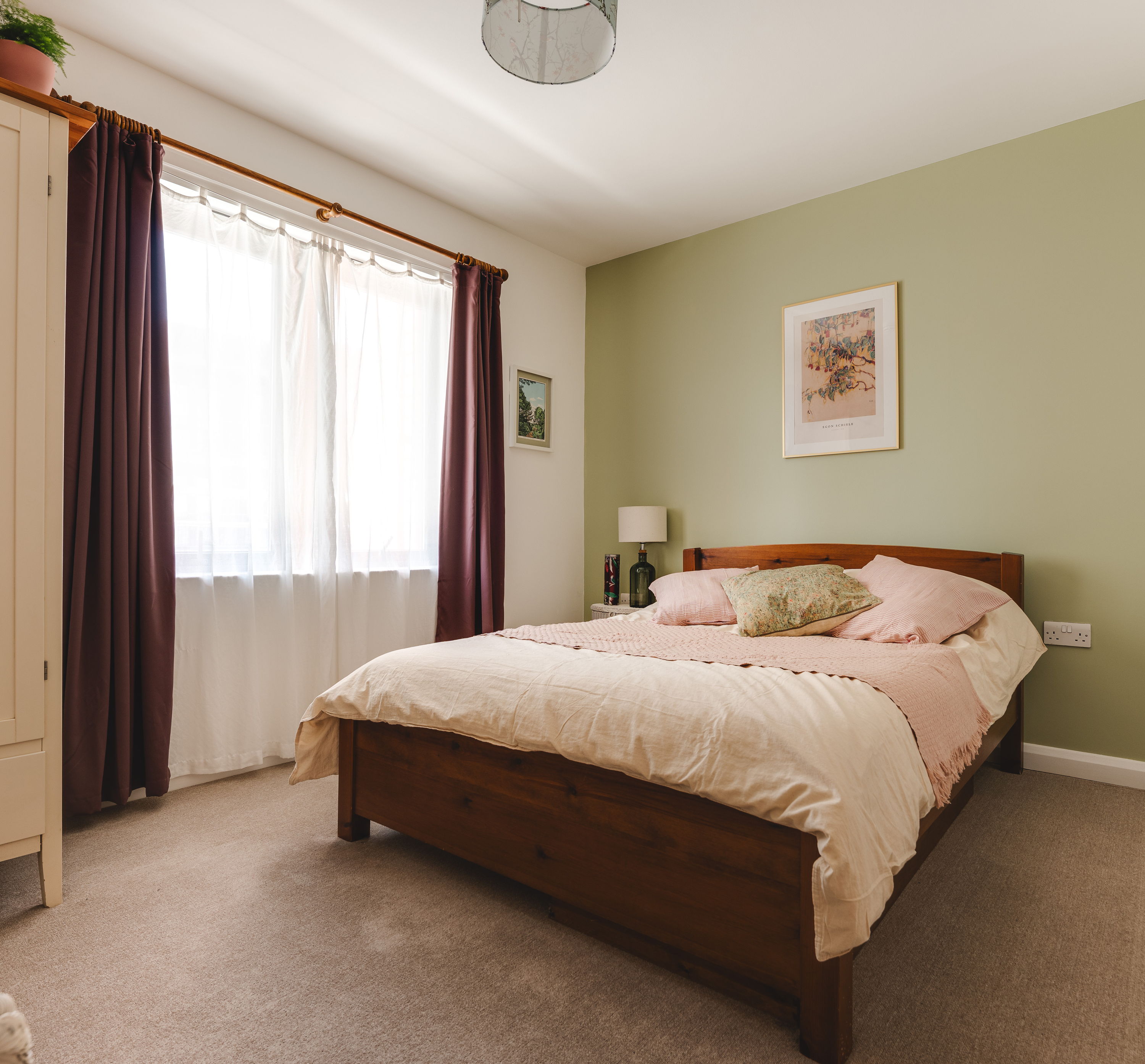 The bedroom sits separately off the hallway. It’s a good-sized double with a softer palette, plenty of room for freestanding furniture, and a calm, quieter feel away from the main living space. In the afternoon, light streams in, lifting the room with a gentle, natural brightness. The bathroom is spacious and well laid out, with a full size bath, fitted shower and shower cover, clean, modern tiling with some Moroccan corner detailing, and a simple, functional finish.