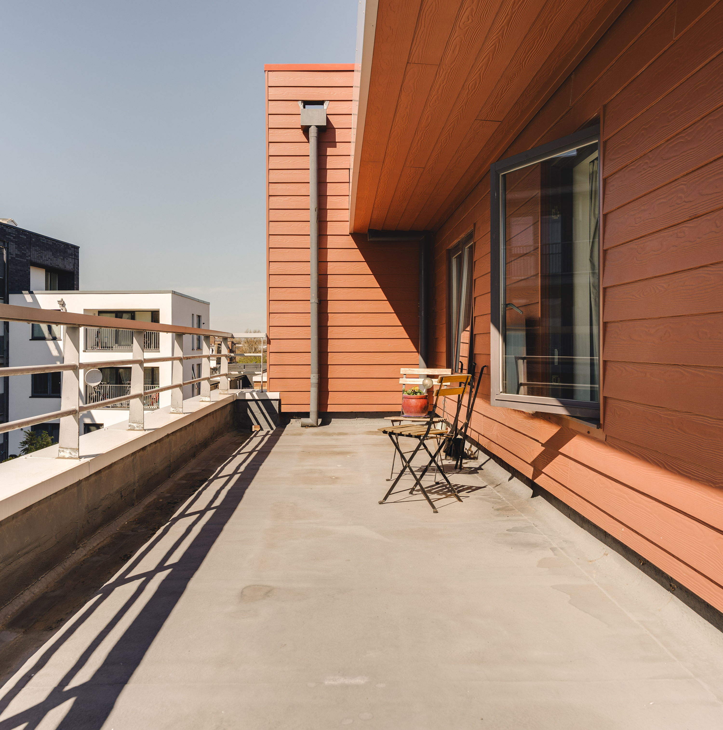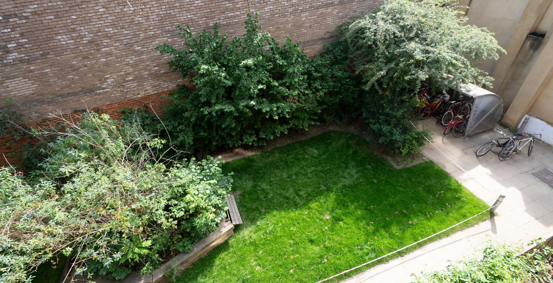 A shared garden space sits just beyond the building, offering a quiet spot to step out and unwind.