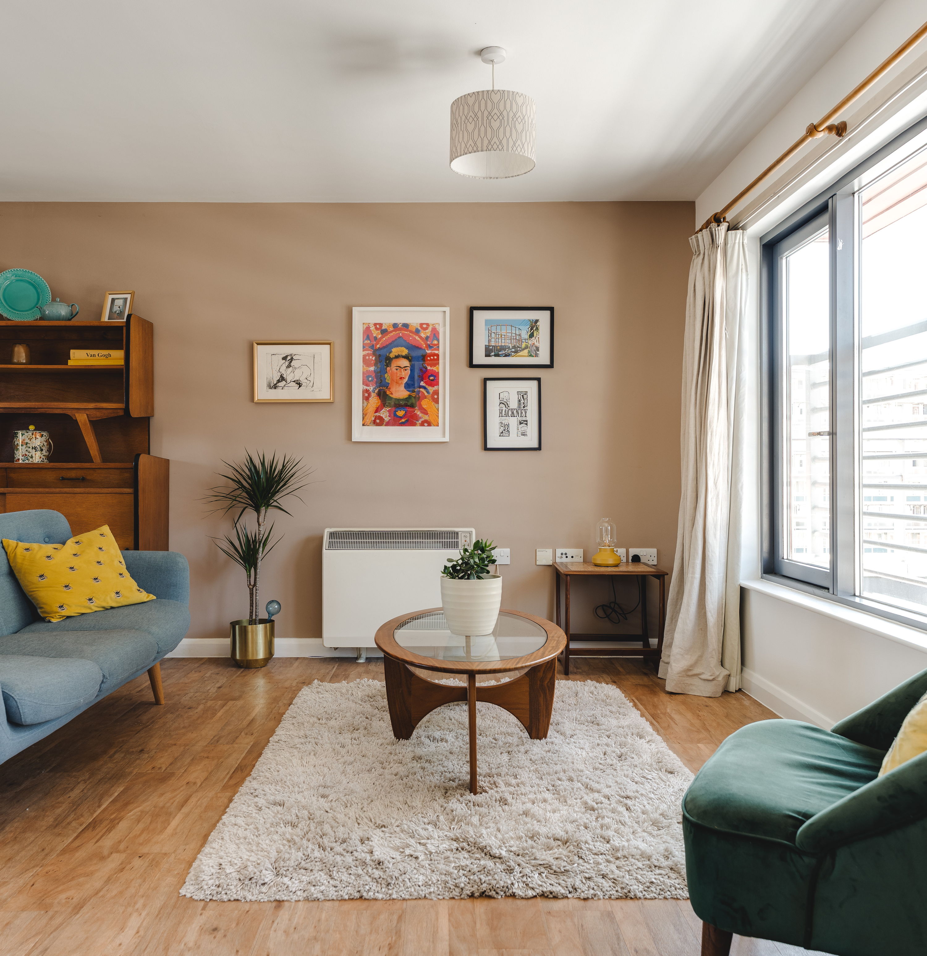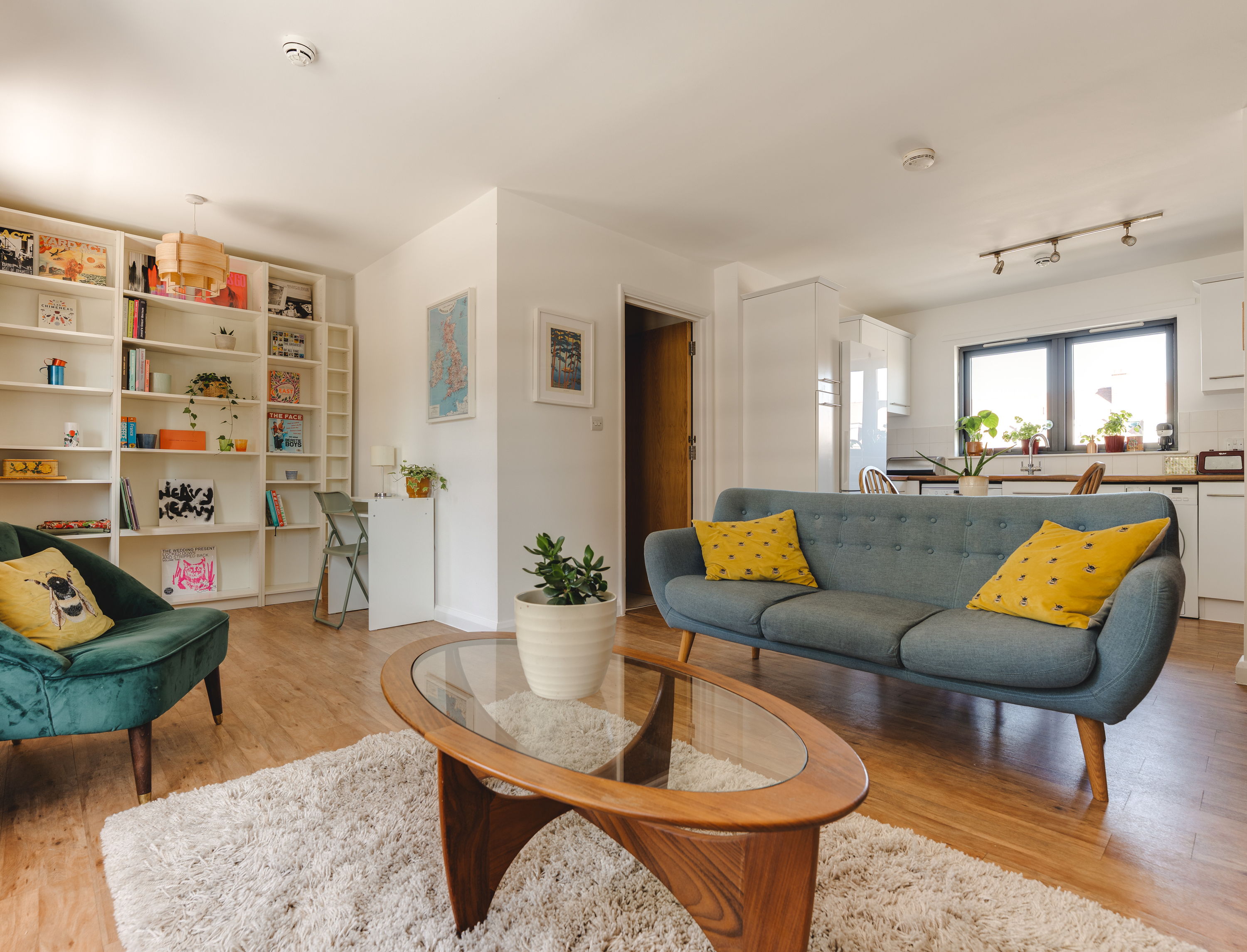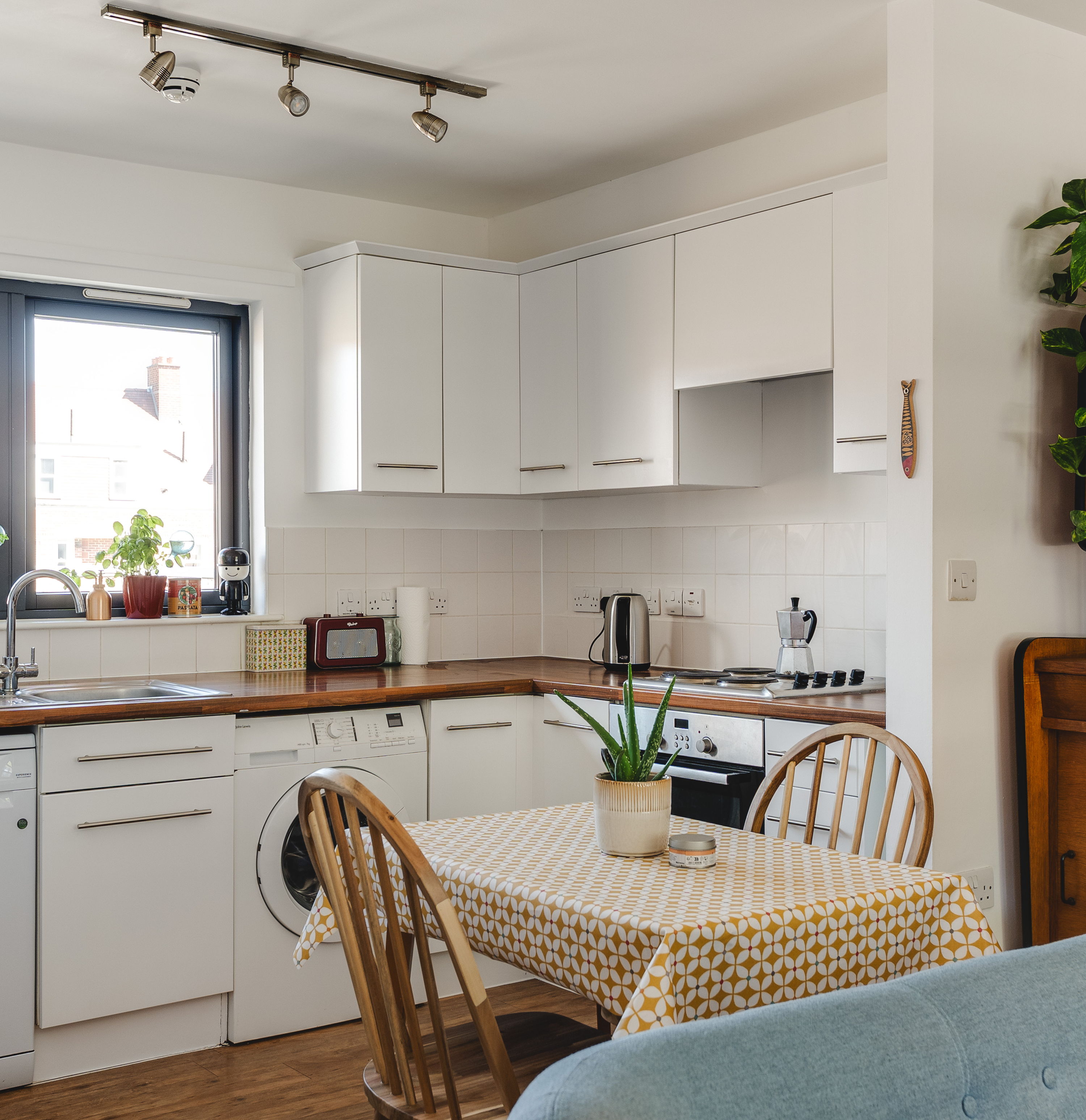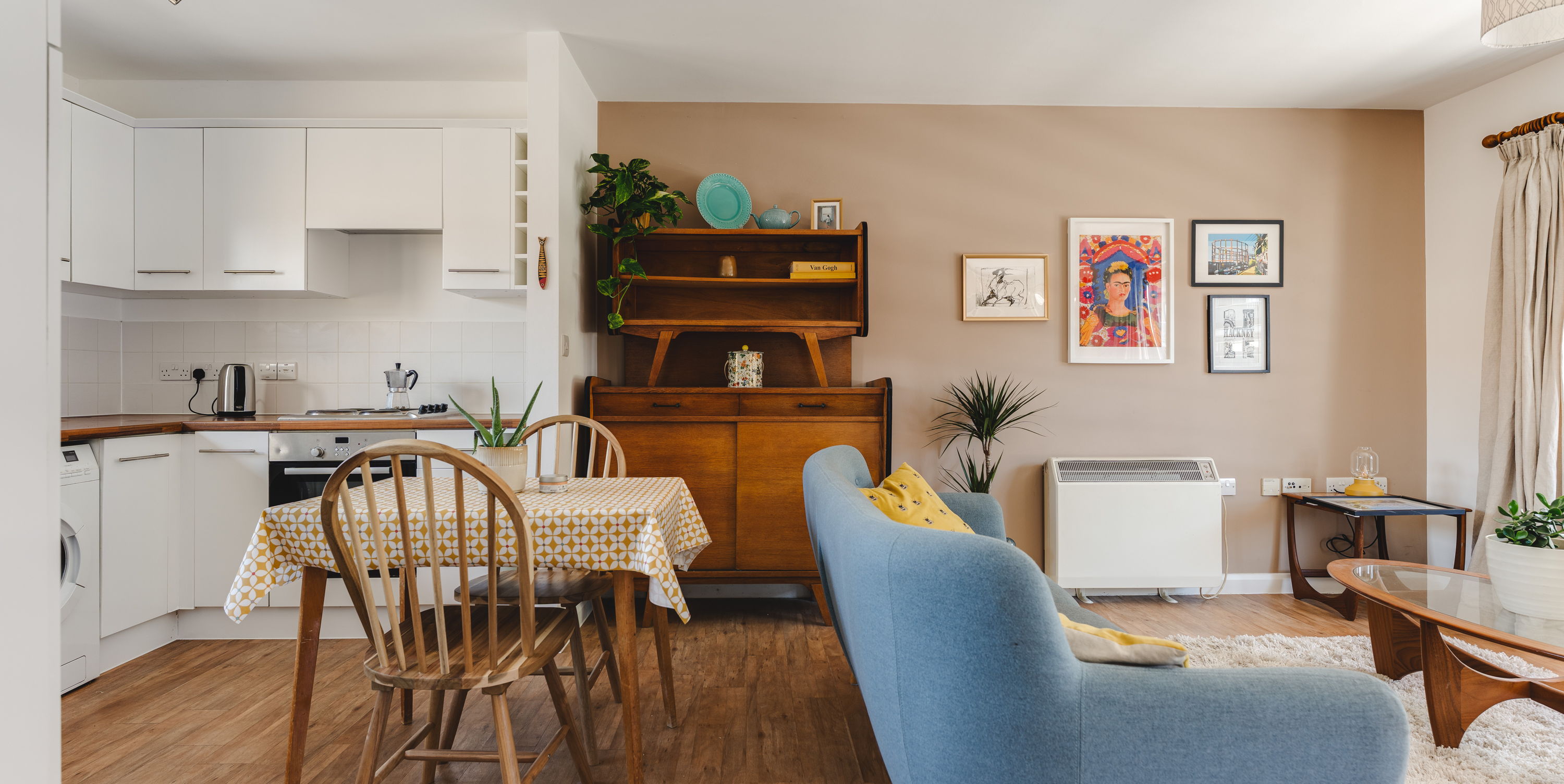 The kitchen sits neatly to one side in an L-shape, finished in clean white cabinetry with timber worktops and integrated appliances, now including a dishwasher. There’s enough room here for a proper dining table, positioned between kitchen and living zones, making it a space that shifts easily from cooking to hosting. The living area is set by the window, where the light is best. It’s a comfortable, well-proportioned zone with space for seating and shelving without feeling tight.
